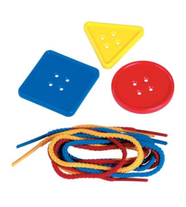 Veľké plastové farebné tvary (štvorec, trojuholník a kruh) na prevliekanie za pomoci farebných šnúrok. Doporučené na...