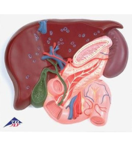 Model zobrazuje játra, žlučník, slinivku, dvanácterník, cévy, žlučovody a vnější žlučové kanálky.