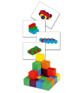 Stavání s dřevěnými kostkami. Sada obsahuje 10ks oboustranných karet, 2ks čtverečních karet s mřížkou, 2ks prázdných...