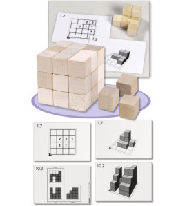 Stavání s dřevěnými kostkami. Sada obsahuje 10ks oboustranných karet, 2ks čtverečních karet s mřížkou, 2ks prázdných...