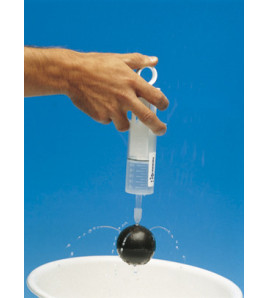 Pomůcka k demonstraci rovnoměrného působení tlaku v kapalinách. Plastová pumpa (stříkačka) s pístem je zakončena...