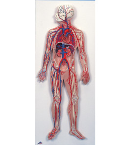 Plastový model ukazuje soustavu tepen a žil, srdce, plíce, játra, slezinu, ledviny a část kostry.