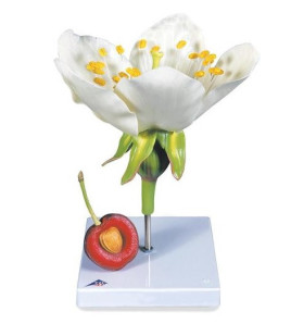 Květ třešně (3 části) a samotný plod. Květ lze rozdělit na polovinu a lze pozorovat ovaria, která jsou odnímatelná....