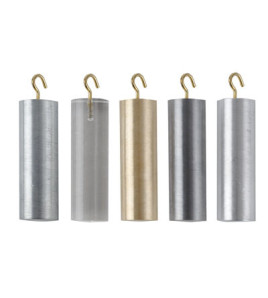Sada 5 válců o průměru 19mm a výšce 60mm, vybaveno háčkem. Materiály: plexisklo, hliník, železo, mosaz a zinek.