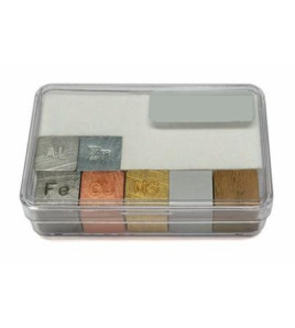 Sada 8 kostek materiálů o různé hustotě: hliník, zinek, železo, měď, olovo, mosaz, dřevo, PVC, rozměr kostky 10x10 mm.