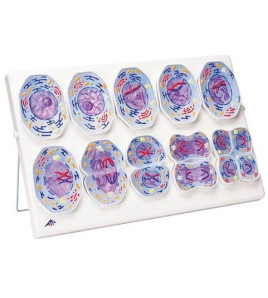 Model ukazuje 9 stadií mitózy na příkladu typické buňky savce v cca 10 000 násobném zvětšení.