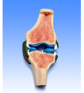 Podélná část kloubu lidského kolena. Struktura kosti, meniskus, chrupavka kloubu, synoviální membrána a kloubní svazky.