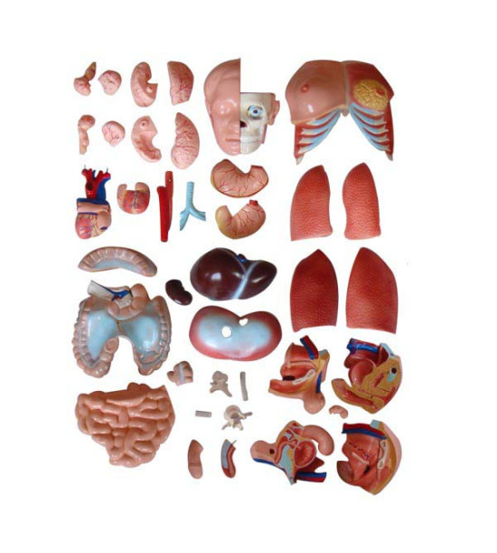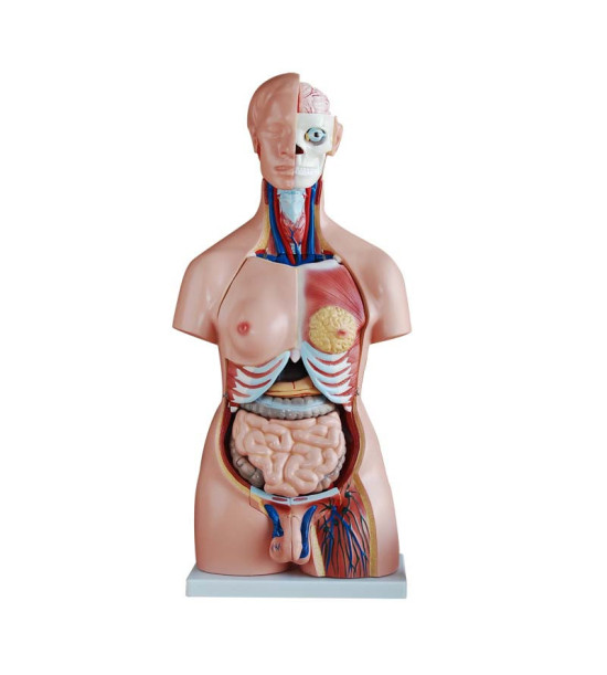 Unisex trup zahrnuje 40 částí: trup, ženské poprsí, hlava, oční bulva, mozek (8 částí), páteřní nervy (4 části), plíce (4 části), srdce (2 části), průdušnice, jícen a sestupná aorta, bránice, játra, ledvina, žaludek (2 části), vnitřnosti (4 části), mužské genitálie (4 části), ženské genitálie s plodem (3 části). Namontováno na podstavci. Výška: 85 cm.