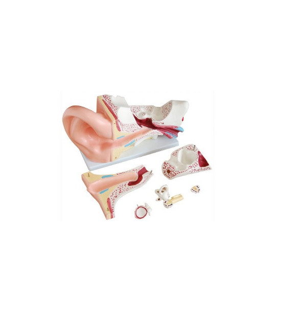 Obrovský model ucha ukazuje tři hlavní strukturální části sluchového orgánu (vnější ucho, střední ucho, vnitřní ucho) a postavení rovnovážného orgánu lidského těla. Model je rozložitelný na 6 částí. 5 krát zvětšený. Namontován na plastovém podstavci. Vyrobený z omyvatelného PVC, odolného vůči nárazům. Velikost: 42x24x16 cm.
