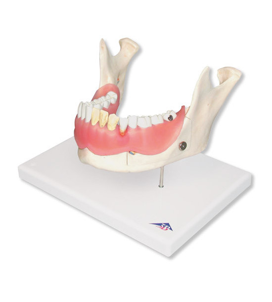 Model zubních kazů je založen na realistické ilustraci spodní čelisti s 16 odnímatelnými zuby dospělého zvětšeného dvakrát. Jedna polovina modelu onemocnění zubů ukazuje osm zdravých zubů a zdravých dásní. Druhá polovina modelu ukazuje následující onemocnění: Zubní plak, zubní kámen, paradentóza, zánět kořene, pukliny a hladký povrchový kaz. Jedna část přední části kosti může být odstraněna z modelu onemocnění zubů, aby se zobrazily kořeny, cévy a nervy. Dvě židle jsou rozděleny podél délky, aby se ukázala vnitřní část zubu. Model dentálních kazů je na podstavci.
