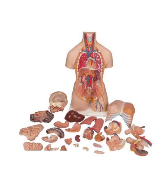 28-dílné torzo s oddělitelnou hlavou (na jedné straně znázorněná lebka s mozkem), 2 plicní laloky, srdce (2 části), žaludek (2 části), játra se žlučníkem, kompletní střevní trakt (4 části), srdce (2 části) , ženská hrudní stěna, přední polovina ledvin, mužské genitálie (4 části), ženské genitálie s plodem (3 části). Otevřené krční a zádové části: obratle, meziobratlové disky, mícha, páteř, vertebrální tepny. Rozměry: 87x38x25 cm. Hmotnost: cca 9 kg.
