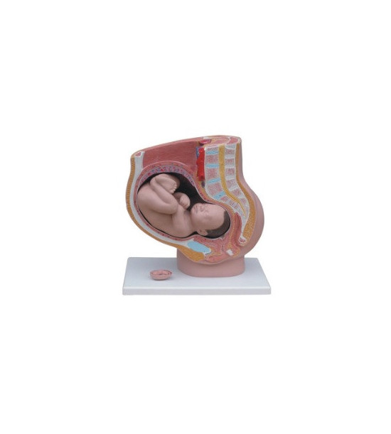 Model ženské pánve zobrazuje průřez pánví během 40. týdne těhotenství s vyjímatelným plodem, normální postavení dítěte před narozením, ženské pohlavní orgány, reprodukční a močové systémy. Na podstavci je model embrya ve třetím měsíci těhotenství. Model je vyroben z omyvatelného PVC, odolného vůči nárazům.