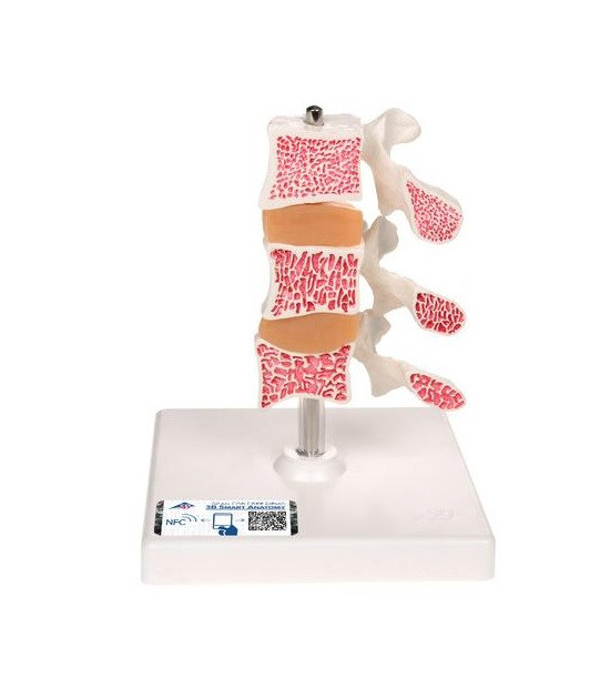 Model lidských bederních obratlů se skládá ze tří bederních obratlů s meziobratlovými plotýnkami. První obratel zobrazuje normální kostní tkáň na rozdíl od dalších dvou, jejichž kostní tkáň je postižena osteoporózou. Dodáváno na podstavci. Rozměr:16cm.