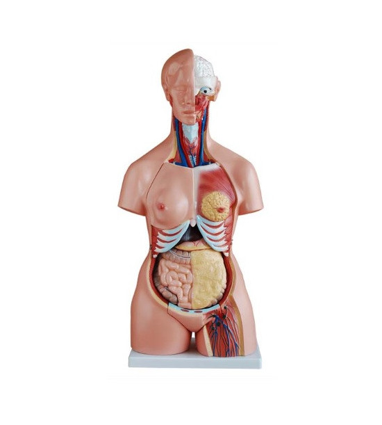 Bezpohlavní trup je rozložitelný na 21 částí: trup, ženská poprsnice, hlava, oční bulva, mozek, páteřní nervy páteře, plíce (2 části), srdce (2 části), játra, ledviny, žaludek, vnitřnosti (2 části), mužské genitálie (2 části), ženské genitálie s plodem (3 části), část bez genitálií. Vyrobeno z PVC. Namontován na podstavci. Výška: 85 cm.