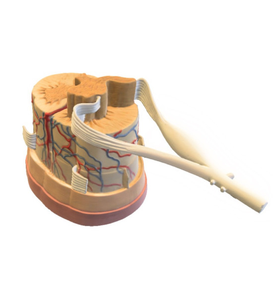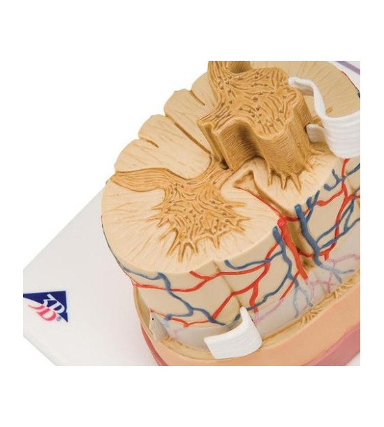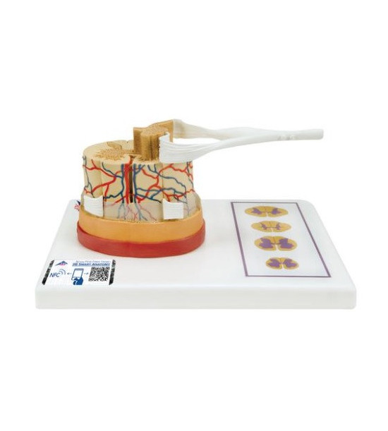 Model lidské míchy, v měřítku 5:1. 3B Smart Anatomy. Mícha je tvořena centrálním kanálem obklopeným šedou hmotou s vnější vrstvou bílé hmoty. Průřez bílou a šedou hmotou. Zobrazena jsou nervová zakončení, míšní kořeny, tepny a žíly, které zásobují míchu. Základ modelu obsahuje ilustrace různých průřezů míchy přes bílou a šedou hmotu, na podstavci jsou ilustrace různých průřezů míchy přes bílou a šedou hmotou v částech krční, hrudní, bederní a křížové oblasti. Rozměry: 26 x 19 x 13 cm, hmotnost 0,66 kg. Možnost používání exkluzivního obsahu virtuální anatomie na chytrém telefonu s následujícími funkcemi: otáčení modelu, zobrazení anatomických struktur, kvíz, rozlišení mužské a ženské anatomie. Chcete-li začít, jednoduše naskenujte QR kód umístěný na vašem anatomickém modelu, stáhněte si novou aplikaci 3B Smart Anatomy a vstupte do virtuálního světa lidské anatomie.