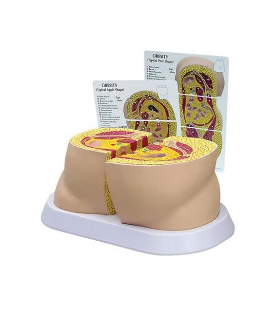 Model Obezita. Obvykle uvažujeme o tuku z hlediska toho, jak vypadáme navenek, ale tento průřezový model boků obrací problém naruby. Těla ve tvaru hrušky a jablka ve dvou průřezech v oblasti boků. Tvar hrušky se označuje jako „spodní tělesný tuk“. Tu tvoří zejména podkožní tuk. Tvar jablka se označuje jako „nitrobřišní tuk“. Vnitrobřišní tuk může být složen z viscerálního a podkožního tuku. Model znázorňuje účinky obezity, jako je komprese viscerálního tuku na tlustém střevě, bederní tepně a žilách, močovodu, tenkém střevě, stehenním nervu. Model obsahuje také vzdělávací karty. Rozměry modelů je cca 8,9 x 15,2 x 8,9 cm.