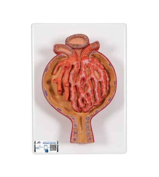 Model lidského Malpighiho tělíska v ledvině, 700x zvětšený. Moč se vytváří v Malpighiho tělísku, uloženém v povrchové části kůry ledviny. Má kulatý tvar o průměru asi 200 mikrometrů. Tvoří ho glomerulus a Bowmanův váček. Rozměry modelu: 26 x 19 x 8 cm. Hmotnost: 0,73 kg. Model vám poskytuje přímý přístup obsahu virtuální anatomie na vašem chytrém telefonu nebo tabletu. Možnost používání exkluzivního obsahu virtuální anatomie s následujícími funkcemi: otáčení modelu, zobrazení anatomických struktur, kvíz, rozlišení mužské a ženské anatomie. Chcete-li začít, jednoduše naskenujte QR kód umístěný na vašem anatomickém modelu, stáhněte si novou aplikaci 3B Smart Anatomy a vstupte do virtuálního světa lidské anatomie.