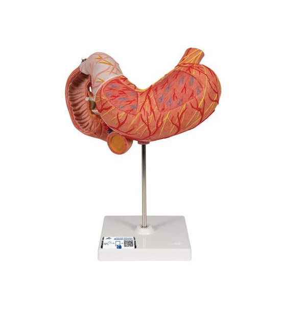 Model žaludku zobrazuje vrstvy žaludeční stěny. Přední polovina je odnímatelná. Zobrazuje: dolní jícen, dvanácterník, slinivku, cévy a nervy. Je umístěn na podstavci.