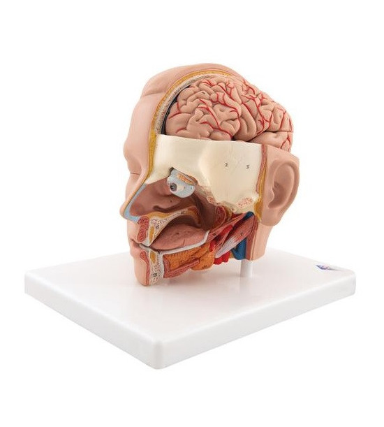 Velmi podrobný model hlavy v životní velikosti, složený ze šesti částí, odhaluje a umožňuje odnímat mozek s arteriemi a oční bulvu s optickým nervem. Odkrytá je nosní dutina. Model dodáván na odnímatelné základně. Rozměry: 19x22x22 cm. Hmotnost: 1 kg.