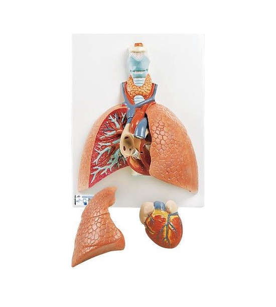 Model obsahuje části hrtanu, průdušnici s průduškami, 2-dílné srdce - podklíční tepna a žíla, dutá žíla, aorta - srdcovnice, plicnice, jícen, 2-dílné plíce, dutá žíla, bránice (přední části jsou odnímatelné), dutá žíla . Na stojanu. Rozměry: 31x41x12 cm.
