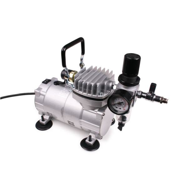 Tento stolní kompresor je bezolejový pístový kompresor s malým elektrickým motorem 1/8 HP, který je navržen pro provoz na platformě Automatics. Je výkonný, kompaktní, spolehlivý a tichý. Obsahuje číselník zobrazující tlak ve výstupním potrubí (0 až 100 psi), spínač zapnutí/vypnutí a spínač výstupu vzduchu a knoflík pro nastavení tlaku vzduchu. Jednotka je napájena z 240V