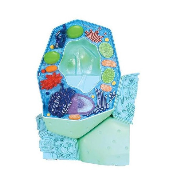 Dvoudílný model rostlinné buňky, znázorňuje struktury typické rostlinné buňky, jak ji lze vidět pomocí elektronového mikroskopu. Cytoplazma a všechny důležité organely rostlinné buňky jsou ve zvýšeném reliéfu a zobrazeny barevně. Obsahuje buněčnou stěnu, buněčnou membránu, jádro, endoplazmatické retikulum, ribozomy, chloroplasty, mitochondria, diktyosomy/Golgiho aparát. Zvětšení cca 10000násobně. Rozměry: 20x12x33 cm, hmotnost 1,5 kg.