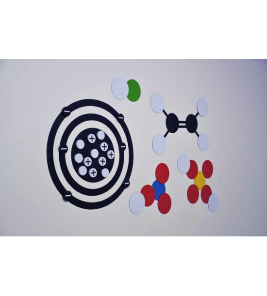Učitelský model atomu a molekuly je demonstrační nástroj, který umožňuje učiteli jednoduchým způsobem prezentovat model atomů, izotopů, iontů a molekul se souvisejícími chemickými vazbami. Všechny části jsou magnetické a lze je použít přímo na tabuli v učebně. Obsah balení: učitelský model atomu (2 atomová jádra, 8 elektronových orbitálů (4 ke každému jádru), 20 protonů, 20 neutronů, 20 elektronů) a učitelský model molekuly (po 20 ks černých, červených a bílých kruhů-atomů, po 1 modrých, zelených a žlutých kruhů-atomů, 50 vazeb, manuál s instrukcemi).