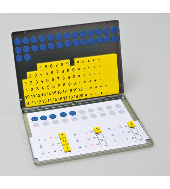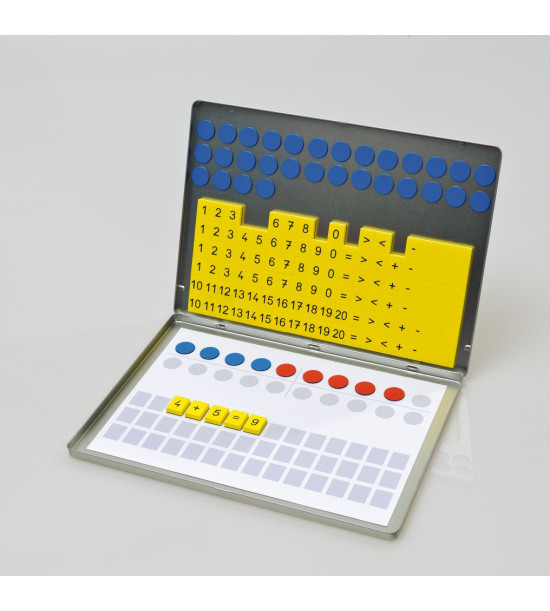 Pro děti zajímavý způsob, jak získat základní dovednosti počítání při práci s kroužky, čísly a znaménky. Kovová krabice se 147 díly. Obsah dodávky: - 39 magnet. kroužků (2cm), - 92 magnet. žlutých dílů (2cm) - z toho 4x čísla 0-9, 2x čísla 10-20 a 6x skupina znamének, - 16 čistých žlutých dílů, - 1 podkladová samolepka.