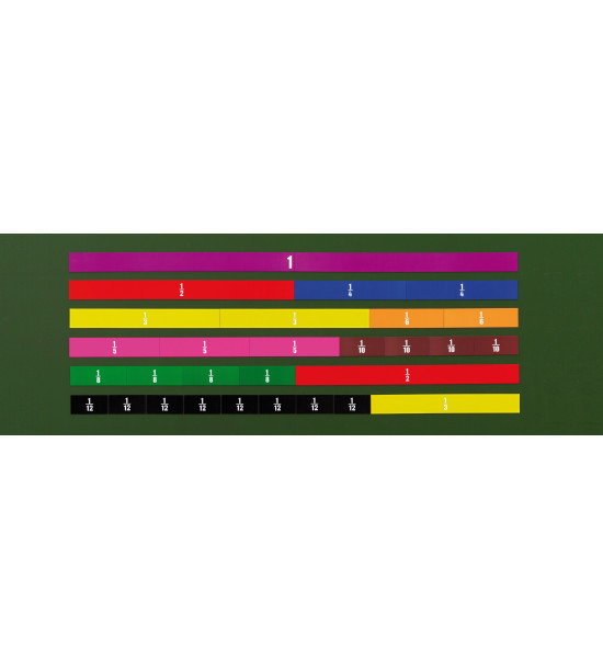 Barevné demonstrační pásy zlomků s využitím na magnetické tabuli. Každý díl zlomku má svoji vlastní barvu a vždy z něj složíte 1 celou. Šířka pasu 4,25cm. Sada: 1/, 1/2, 1/3, 1/4, 1/5, 1/6, 1/8, 1/10, 1/12.