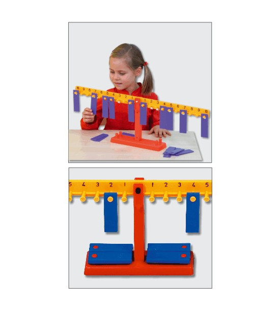 Souprava matematické váhy a 20ks závaží (10g). Ramena váhy jsou pro názornost a snazší orientaci označena čísly 1-10. Pomůcka poslouží k hravému objasnění a pochopení pojmů jako jsou sčítání, odčítání, chybějící číslo, základy rovnice.