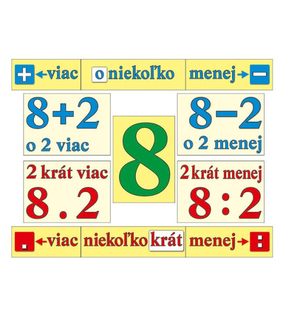 Pomůcka pro tvůrčí upevňování spojů a pojmů při počtových výkonech používaných hlavně ve slovních úkolech: - o několik méně - o několik více (sčítání a odčítání) - několik krát méně - několik krát více (násobení a dělení) Celkem 87ks - demonstračních kartonových obrazů a kartiček na vysvětlení učiva Obsah : 27ks pracovní karty + magnety / 45 x 32cm 60ks číselné kartičky + magnety / 4,7 x 4,7cm