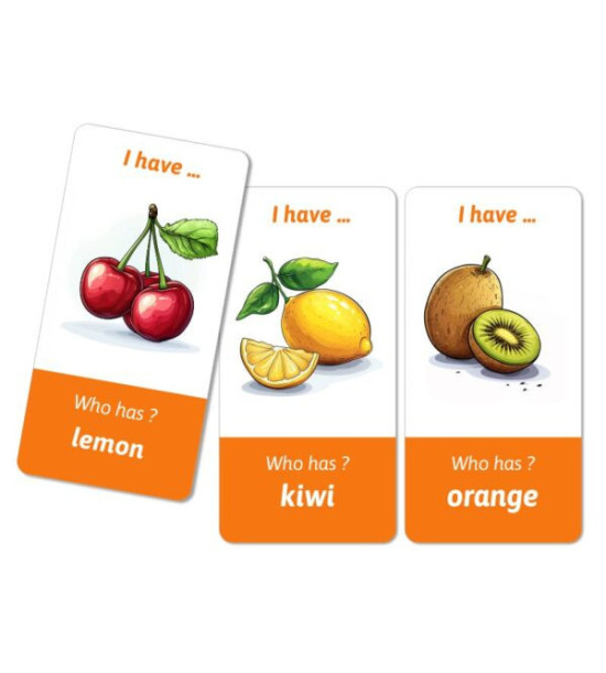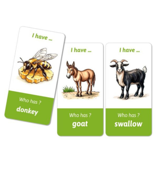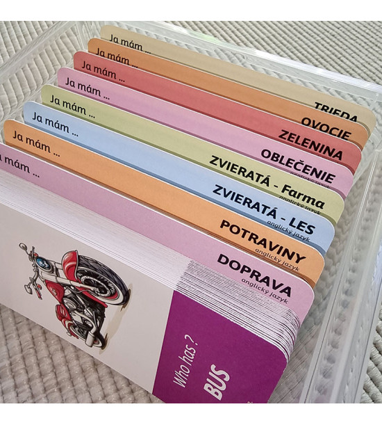 Zvýhodnená ponuka edukačný hier typu „Ja mám, kto má“ pre výuku angličtiny pre základné školy. Obsahuje 8 hier pre hravé precvičovanie slovnej zásoby.Balík obsahuje témy: Ovocie; Zvieratá na farme; Zvieratá v prírode; Trieda; Oblečenie; Potraviny; Dopravné prostriedky.