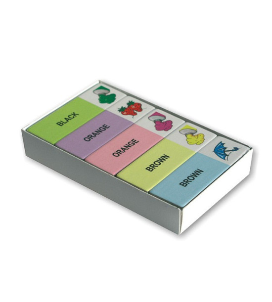 Dominový rychlotest / AJ Barvy - obsahuje v jednom balení 5 samostatných sad. Každá sada má svoji barvu a obsahuje 10 kartiček se slovní zásobou z daného okruhu. Celkem 50 procvičení slovíček. Další varianta klasické pomůcky v novém atraktivním šatu. Potřebujete zaměstnat neposedné žáky, hravou formou utvrdit nebo rychle přezkoušet znalosti učiva? Dominový rychlotest obsahuje v jednom balení 5 samostatných sad. Současně počítají pět žáci nebo pět skupin. Každá sada má svoji barvu. Obsahuje 10 kartiček se slovní zásobou z daného okruhu. Při správném složení všech kartiček musí obrázek na poslední navazovat na slovíčko první. Obsah: 5 sad po 10 kartiček / 7,5 x 2,5cm - kartička / 2mm laminovaný karton Baleno v kartonové krabičce.