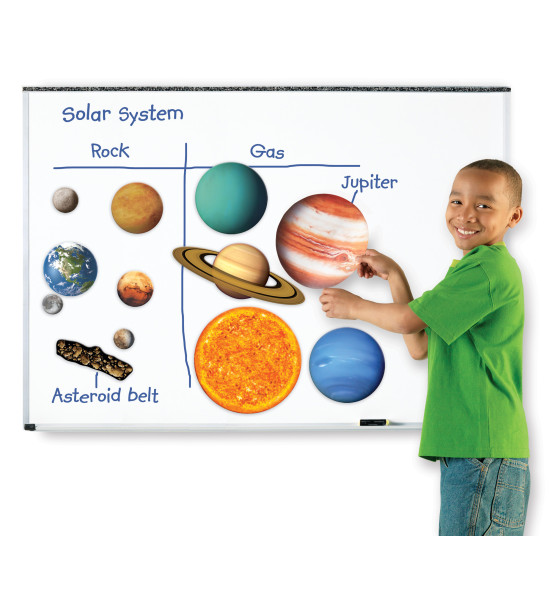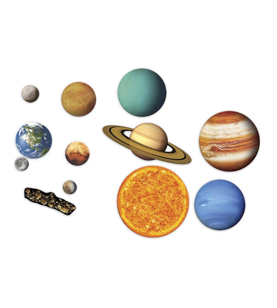 Barevné realistické magnety sluneční soustavy. Obsahuje 8 planet, Pluto (trpasličí planetu), Slunce, Měsíc, pás Asteroidu a návod. Největší magnet (Slunce) měří v průměru 25cm. Věk 5+
