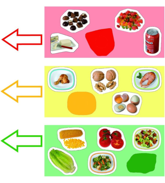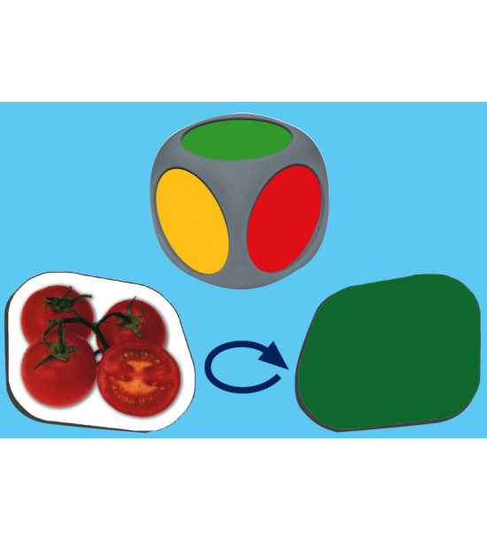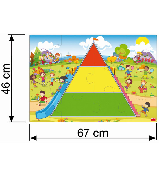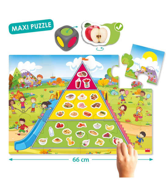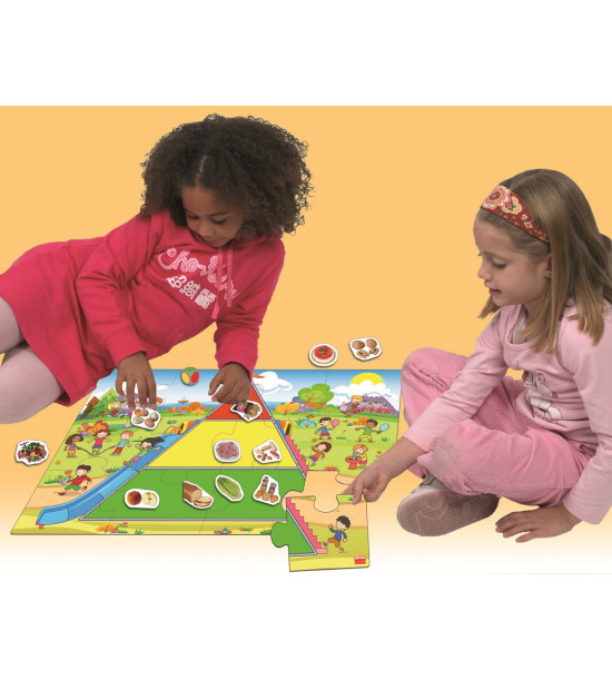 Hoďte kostkou a podle barvy, která vám padne doplňte do pyramidy jednu z následujících potravin: zelená (potraviny, které jíme často), žlutá (někdy), červená (příležitostně). Hra obsahuje 1 kostku, pyramidu puzzle velkého formátu (66 x 45 cm), 45 kartiček potravin, pedagogický návod a samokontrolní opravný systém.