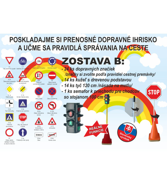 Poskládejte si přenosné dopravní hřiště a učme se pravidla chování na cestě. Semafor, 12 ks dopravních značek a sestava křižovatek (banner 8,5x2,5m) jsou vhodných pro zvyšování vědomostí, zlepšování orientace v silniční dopravní situaci ak poklesu dopravních nehod zapříčiněných dětmi. Přenosné dětské dopravní hřiště a dopravní výchova jsou jedním z nástrojů na snižování dopravní nehodovosti formou prevence pro děti a mladistvé. 12 ks - kužel s dřevěnou podstavou; 12 ks - kotvící tyč 120 cm; 12 ks - dopravní značky - velikost značky je 29x29 cm, O29cm; 1 ks - semafor se stojanem 100 cm; 1 ks - přenosná sestava křižovatek 8,5x2,5m (banner).