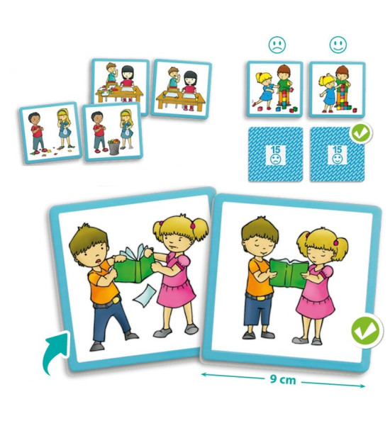 Výborná motivační pomůcka k vedení dialogu s dětmi o jejich chování ve škole, což je akceptovatelné a co ne, správnost postoje v různých situacích, vztah ke spolužákům. Obsahuje 34 kartiček (9x9 cm).