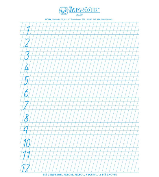 Na smazáčku Číslice a čtvercová síť se děti učí psát číslice a později počítat příklady bez stresu, neboť chybu mohou vygumovat, opravit a počítat dál. Na druhé straně je čtvercová síť, na ní si mohou děti hrát všechny hry známé na čtverečkovém papíře. lodičky, piškvorky, nebo řešit množství námětů a úkolů včetně začátků seznamování se s geometrickými útvary.