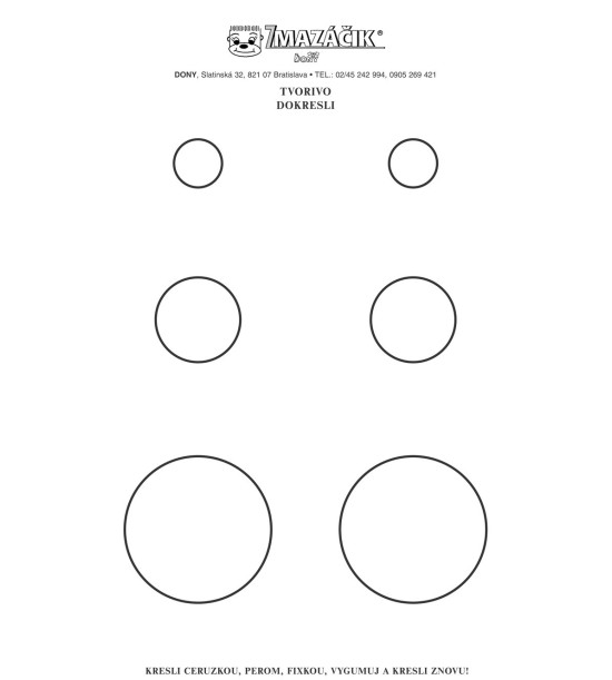 Smazáček Tvořivě dokresli slouží k rozvíjení tvořivosti dětí, které mají uvedené předlohy dokreslit dle vlastní fantazie. Děti si zde mohou procvičovat nejen množství, ale také rozmanitost nápadů. Na první straně jsou kružnice různé velikosti. Pokud dítě doplní tyto kružnice například. jako nejmenší, větší a největší kvítek, je to dobře. Ale doplní-li nejmenší kružnici např. jako knoflík, větší než kvítek a největší jako sluníčko, to je lepší řešení, protože zde zaznamenáváme nejen množství, ale také větší rozmanitost nápadů. Předkreslené útvary na druhé straně Smazáčka může dítě doplnit zase dle vlastní fantazie a tím si rozvíjet tvořivost.