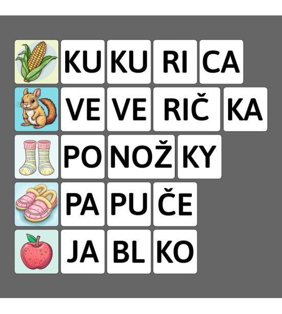 Cvičení může probíhat různými způsoby - učitel může rozdělit kartičky s obrázky mezi děti a na společnou plochu rozložit kartičky se slabikami. Děti pak postupně vyhledávají slabiky potřebné ke složení názvu svého obrázku. Alternativně lze pracovat pouze s kartičkami se slabikami, kde děti vybírají slabiky ze společné kopy a samostatně skládají smysluplná slova. Tento set je ideální pro předškoláky a mladší školáky, podporuje týmovou práci, rozvoj jazykových schopností, čtenářské gramotnosti a fonematického uvědomování. Děti si zábavným způsobem zdokonalují své schopnosti ve čtení a skládání slov, čímž získávají sebedůvěru v práci s jazykem. Obsah: 150ks kartiček z 1.5mm lepenky Kartonová krabice.