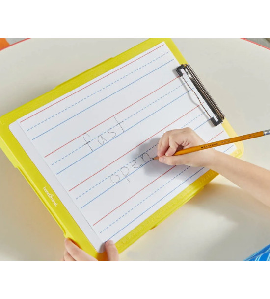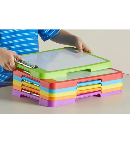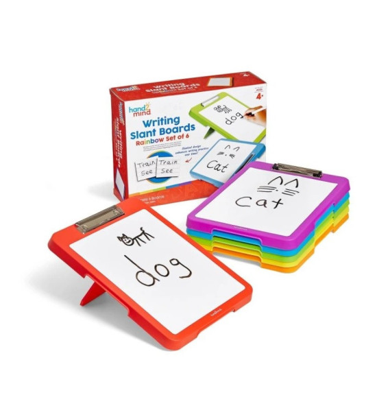 Tabulky mají popisovací/stírací povrch, klip pro uchycení papíru A4 a zabudovaný stojan pro šikmé naklopení, což minimalizuje únavu při psaní. Ergonomický náklon podporuje správné držení ruky a zdravé držení těla. Je možné je používat vodorovně i svisle. Psát lze pomocí stíratelných popisovačů přímo na tabulku, nebo tužkou/perem/pastelkou na připnutý list papíru. Obsah: 3 psacích/kreslících desek v 6 barvách. Rozměry desky cca 33 x 25 x 3 cm.