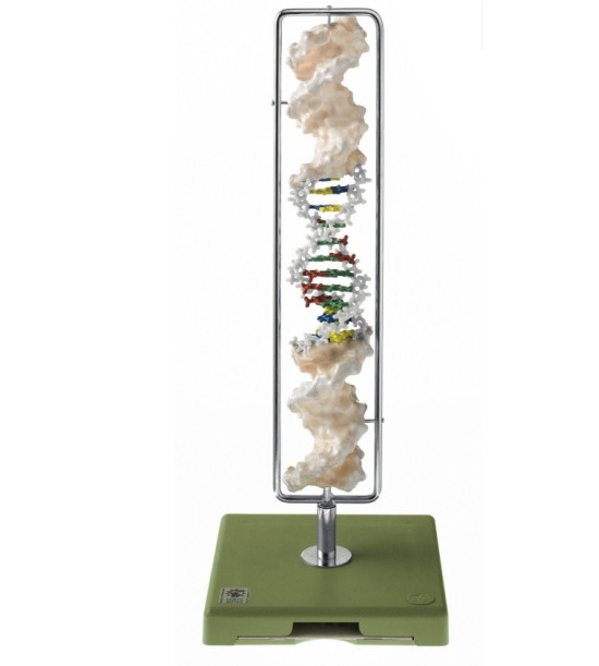 Model dvouzávitnice molekuly DNA (Typ B-DNA) vyroben z SOMSO plastu. Nerozebíratelný model na rotačním zeleném podstavci. Model zobrazuje na základě údajů rentgenové strukturální analýzy část dvojité spirály DNA. Stavba dvojité spirály odpovídá tzn. B-DNA, která je ve srovnání s formou A nebo Z fyziologicky nejdůležitější. Jedná se o pravotočivou dvojitou spirálu s 10,5 páry bází na otáčku, což odpovídá rozestupu přibližně 3,4 nm. V podstatě se shoduje s modelem struktury DNA, který postulovali Watson a Crick v roce 1953. Měřítko 30 x 10 000 000 : 1. Rozměr 47,5 x 18 x 18 cm. Hmotnost 1 kg.
