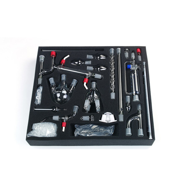 Tato přístrojová sada umožňuje sestavení pokusů v anorganické a organické chemii. Jednotlivé části jsou odolné proti rozbití, jsou přehledně uspořádány ve třech tvarovaných boxech z pěnové hmoty. Obsahuje: * 1 kulatá baňka s kulatým dnem, 250ml, * 1 kuželová baňka 10ml, * 3 kuželové baňky, 25ml, * 1 dest. můstek Claisenů, * 1 destilační prodlužovací díl, ohnutý, * 1 destilační předloha Brett, * 1 destilační kolona Vigreux, * 1 destilační kolona Hempel, * 1 nástavec Anschutz, * 1 okapovací nálevka s vyrovnáním tlaku, * 1 1 zátka s vnitřním zábrusem se šroubováním GL18, * 2 zátky, sklo, * 2 zátky PE, * 3 silikonové zátky, * 1 tyčový teploměr, -10...+250°C, *1 tyčový teploměr -10...+ 360°C, * 9 svorek na zábrusem, * 1 Raschigovy kroužky, paket 250g, * 2 kapilární trubičky, 300 x 8mm, * 3 porcelánové spalovací žlábky, * 1 těsnící kroužek, sada 10ks, * 2 tyč.