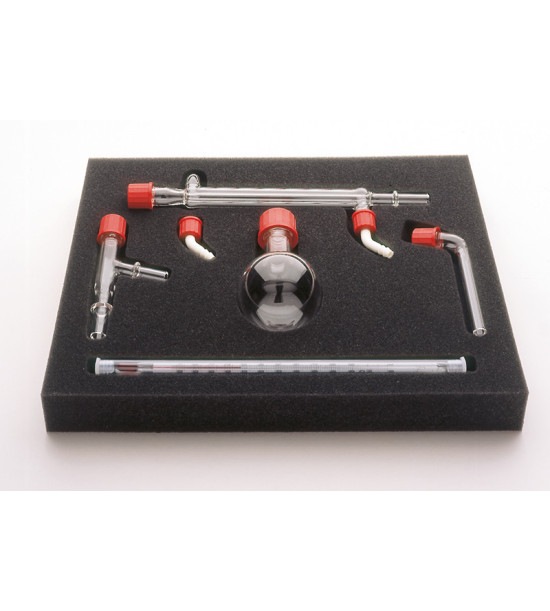 Sada laboratorního skla pro sestavení destilační soupravy. Bez stativové soupravy. Pomocí tohoto setu lze bezpečně provést všechny obvykle prováděné destilační procesy. Studenti mohou sledovat chlazení vody a oddělování kapalin na základě jejich odlišných teplot varu. Části soupravy jsou bezpečně uloženy v pěnové vložce. Pro transport a uskladnění doporučujeme doobjednat plastový box s víkem.