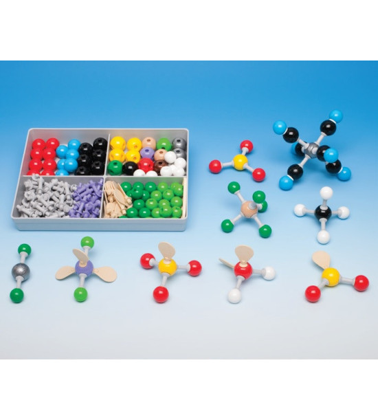 14 různých molekulárních modelů podle teorie VSEPR Valence Shell Electron Pair Repulsion (teorie odpuzování elektronových párů valenční vrstvy, valenční elektrony se kvůli jejich stejnému náboji navzájem odpuzují a proto nabudou tvar při kterém je toto vzájemné odpuzování co nejmenší ). Tvary molekul: lineární (1), trigonálně-planární (2), tetraédrické (4), trigonálně-bipyramidalní (4) a oktaédrické (3). Sada obsahuje: Atomy šedý: 2 otvory, lineární (např. BeCl2) žlutý: 3 otvory, trigonální, (např. SO3) černý: 4 otvory, tetraedrický, (např. CH4) žlutý: 4 otvory, tetraedrický, (např. SO32 -) červený: 4 otvory, tetraedrický, (např. kyslík v H2O) světle zelený: 4 otvory, tetraedrický, (např.fluor v HF) světle hnědý: 5 otvorů, trigonální-bipyramidální, (např. fosfor v PCL5e) žlutý: 5 otvorů, trigonální-bipyramidální, (např. síra ve SF4) zelený: 5 otvorů, trigonální-bipyramidální, (např. chlor v ClF3) purpurový: 5 otvorů, trigonální-bipyramidální, (např. xenon v XeF2) šedý: 6 otvorů , oktaedrické, (např. metalické komplexy) hnědý: 6 otvorů, oktaedrické, (např.brom v BrF5) měděný: 6 otvorů, oktaedrické, (např. měděné komplexy) Vazby 50 ks. střední (šedá, jednoduchá vazba) 15 ks. střední (purpurová, znázorňuje osamocené páry) 6 ks. krátká (bílá).