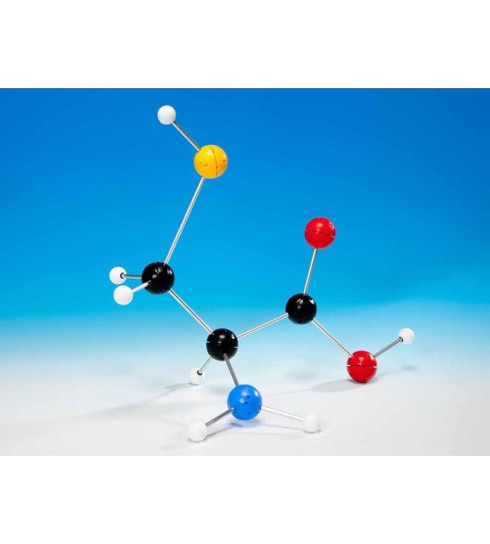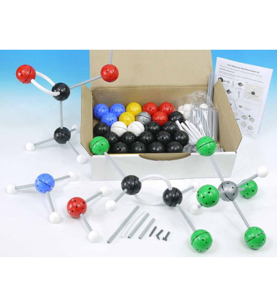 Stavebnice Unit - Velká demonstrační sada. Souprava se kterou můžete demonstrovat molekulární tvary s rotujícími jednoduchými vazbami a nerotujícími dvojitými a trojitými vazbami, strukturální izomery a optické izomery, kruhové struktury, „flip“ cyklohexanu a VSEPR. Umožňuje vytvořit modely uhlovodíků, alkoholů, aminů, organických a anorganických kyselin a zásad, uhlohydrátů, benzenu, chlorových molekul, anorganických molekul. Výhody této soupravy: Modely lze vidět ze zadní části třídy, vazby a atomy jsou v měřítku s přesností 8,5 cm na 100 pm, pevné kolíky spojují všechny atomy v jakémkoli úhlu vazby, snadná manipulace, stavění a rozkládání, vysoce odolné plastové díly . Celkový obsah: 70 atomů (koule se spojovacími kolíky) a 90 pevných a pružných vazeb. Pevné spoje jsou vyrobeny z plastu, který poskytuje pohodlí a odolnost při snížených nákladech. Sada až se 7 barevně odlišenými jádry atomů o velikosti 4,4 cm a bílým jádrem vodíku o velikosti 2,5 cm.