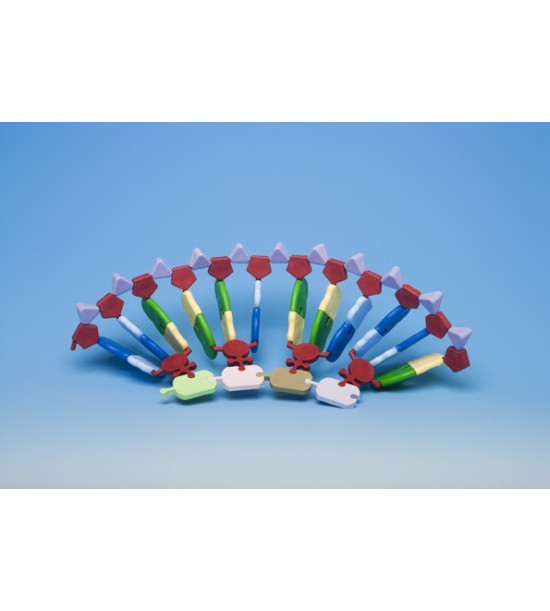Ribonukleové kyseliny RNA - struktura při přenosu genetické informace: Přepis genetické informace (transkripce): k odhaleným nukleotidem jednoho rozpleteného vlákna DNA jsou komplementárně připojovány volné nukleotidy. Vytvoří se molekula mRNA - mediatorová RNA. Překlad genetické informace (translace): mRNA se napojí na organelu ribozom a tRNA - transferová RNA se spojí s aminokyselinou a přeloží genetickou informaci, vytvoří se polypeptidový řetězec a příslušná bílkovina. Souprava obsahuje 24 bází, což odpovídá 8 kodonům v jednovláknovém modelu mRNA, jakož i 4 části tRNA ve tvaru "jetelového listu" a 4 části aminokyselin. Dodávka zahrnuje: 6x uracil (světle modrý), 6x adenin (modrý), 6x guanin (zelený), 6x Cytosin (žlutý), 12x ribóza (červená), 12x fosfát (fialový), 4 části tRNA a 4 části aminoky.