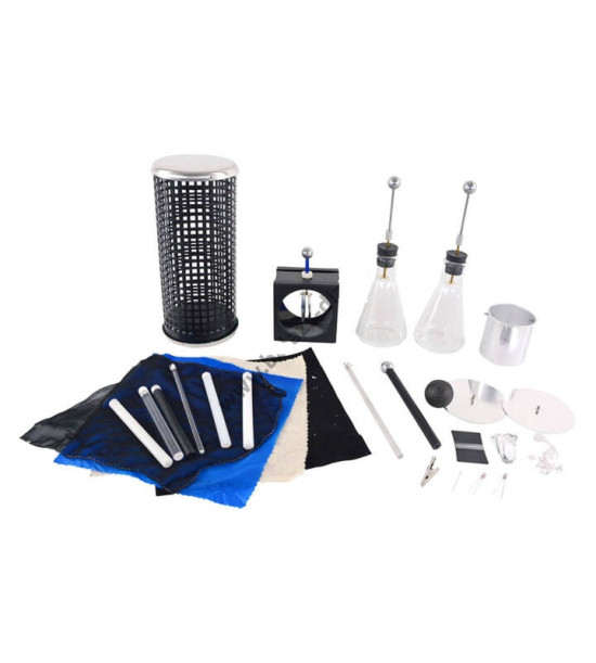 Žáková elektrostatická souprava. Obsah soupravy: Faradayova klec, 2 elektroskopy se skelnými baňkami, 1 elektroskop s kovovým tělem, 2 kulovité a diskové koncovky, 6 označených třecích tyčí, neonová lampa, nádobka, acetátová a polyethylenová tkanina, kuličky.