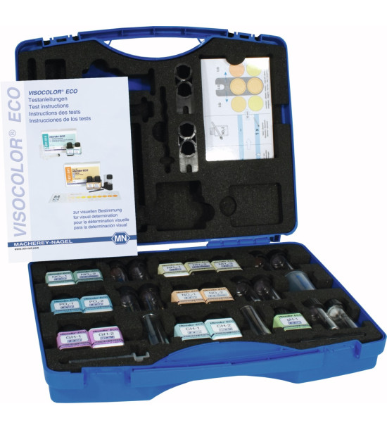 Kufřík pro analýzu vody VISOCOLOR ECO je ideální mini laboratoř pro VIZUÁLNÍ analýzu vody na místě odběru vzorků v terénu. Vlastnosti: Barevné štítky VISOCOLOR ECO mají odpovídající zřetelné symboly, chránící před záměnou činidel. Kolorimetrické a titrační testovací sady pro nízké koncentrace. Jednoduchá obsluha díky manuálu formou piktogramů. Nejsou používána toxická činidla, použité analytické vzorky se mohou běžně zlikvidovat. Činidla postačují na 50 – 100 testů, určení hodnoty testu pomocí srovnávací metody se vzorovými výsledky. Pro kufřík VISOCOLOR ECO jsou k dispozici kompletní sady činidel, jsou v ekologicky nezávadných obalech ve vyjímatelné vložce a obsahují přehledné manuály. Sada VISOCOLOR ECO obsahuje testovací sady činidel pro stanovení: - Amonie 0,2...3 mg/l NH4, 50 testů. - Uhličitanové tvrdosti 1 kapka = 1°d, 100 testů. - Celkové tvrdosti 1 kapka = 1°d, 110 testů. - Dusičnanů 4...120 mg/l NO3, 110 testů. - Dusitanů 0,02...0,5 mg/l NO2, 120 testů. - pH 4,0...9,0, 450 testů. - Fosfátů 0,2...5 mg/P, 80 testů. - Plastová stříkačka 5 ml pro odběr vzorků, 2 odměrné nádoby 20 mm se šroubovacím uzávěrem, posuvný komparátor pro testování obsahu vzorků, reagenční lahvičky, odměrná lžička 70 mm, vzorník barev. Fotometr není součástí balení. Hmotnost balení 1765g. Rozměry balení 365 x 305 x 168 mm.