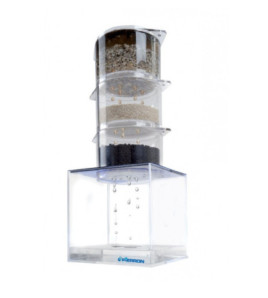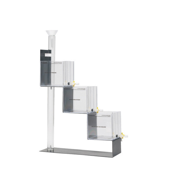 Demonstruje 3 hlavní etapy čištění odpadních vod: primární filtraci (odkalování), biologické čištění a sekundární dekantaci. Části modelu jsou upevněny na panelu. Model lze zcela rozebrat, což usnadňuje jeho čištění. Dodává se s přípravky představujícími nečistoty a mikroorganismy pro biologické čištění, ale také s prostředky nutnými k přípravě pufrů. Směs představující odpadní vody (připravená přidáním různých přípravků do vody) se nalije do horní části čistící stanice. Po jejím přejetí jednotlivými etapami čištění získáme opět čistou vodu zbavenou nečistot, ať už kousků plastů, písku, oleje či jiných organických látek (zde nahrazených cukrem). Čištění probíhá pomocí těchto postupů: filtrace přes řídká síta, zachycení kousků plastů, zachycení části písku v kolmém válci, dekontace oleje, odčerpání vody do další nádoby přes filtrační papír a uzavření kohoutku před průchodem vrchní olejové vrstvy, rozložení organických hmot (kvasinek) v biologické nádrži. Tato etapa je urychlena provzdušňováním (akvarijní provzdušňovač). Obsah cukru se měří glukometrem nebo testovacími kroužky . Na konci čištění lze odstranit mikroorganismy přidáním roztoku chloridu železnatého: sekundární dekantace . Rozměry: 320mm x 355mm x 105mm. Nezbytné příslušenství: potravinářský olej, destilovaná voda, voda z vodovodu, roztok chloridu železnatého, filtrační papír, akvarijní pumpa, glukometr "Glucotrend", testovací kroužky pro glukometr Glukotrend, malá magnetická míchačka, kádinka, klasické laboratorní sklo, pipety